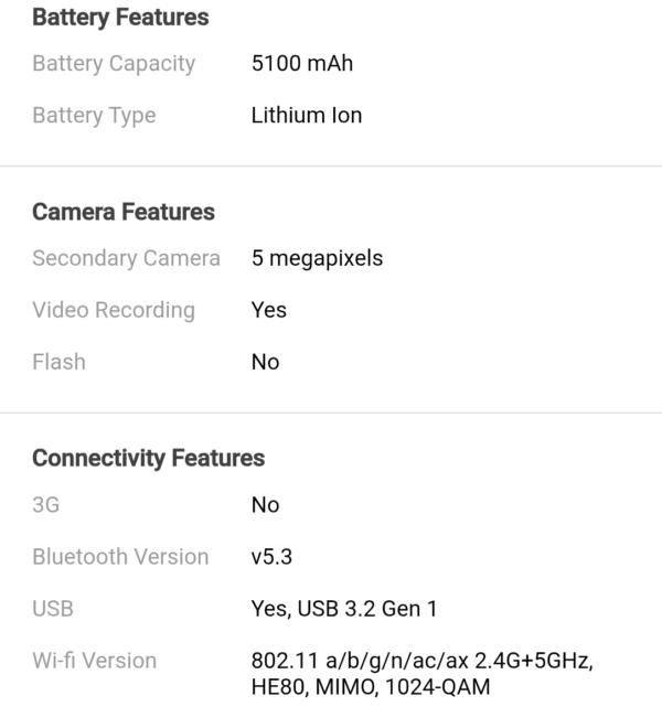 Wi-Fi 5 (802.11 a/b/g/n/ac), Bluetooth 5.1, GPS, USB Type-C 2.0.